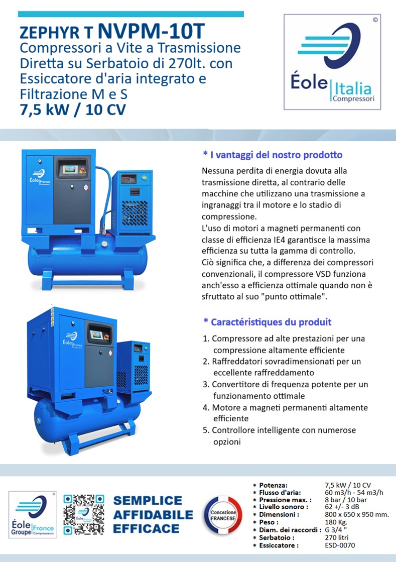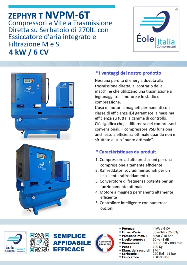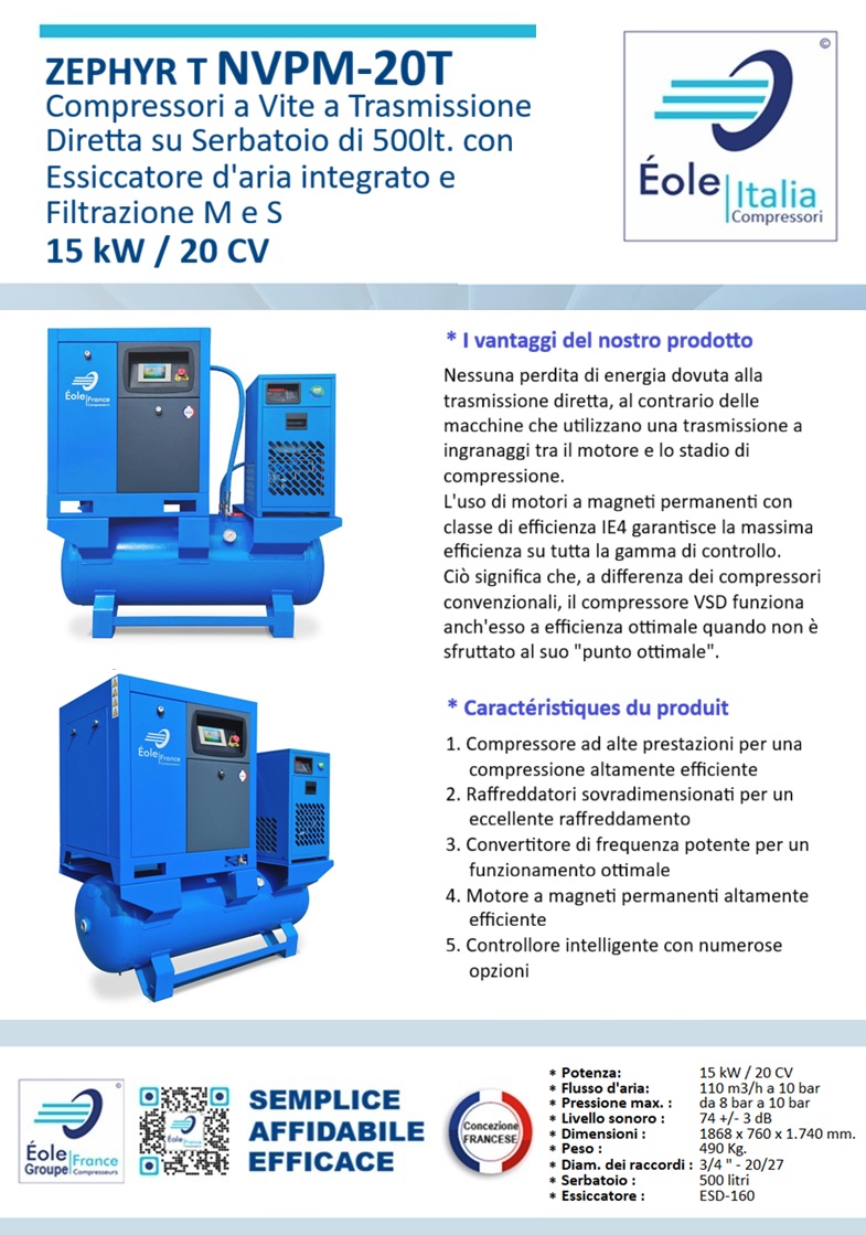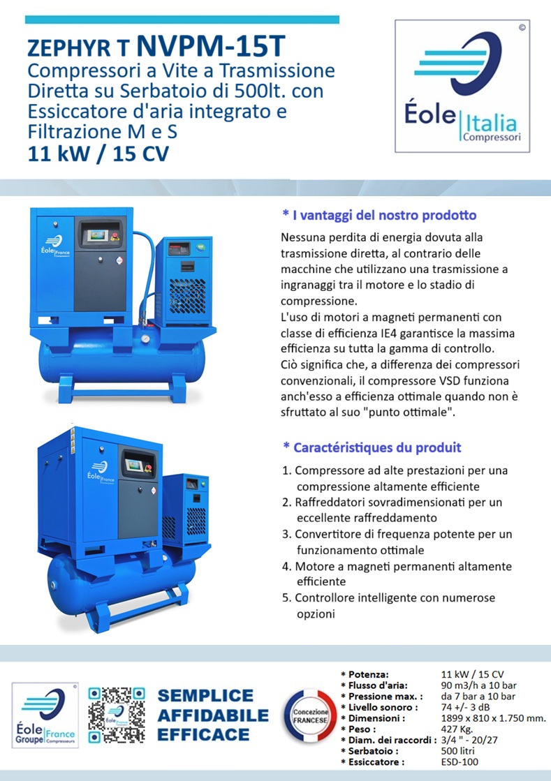 La nostra soluzione « 4 in 1 » comprende un compressore a vite a velocità variabile, un essiccatore a refrigerazione, 2 filtri e un serbatoio dotato di un separatore automatico, pronto all'uso per un utilizzo duraturo.